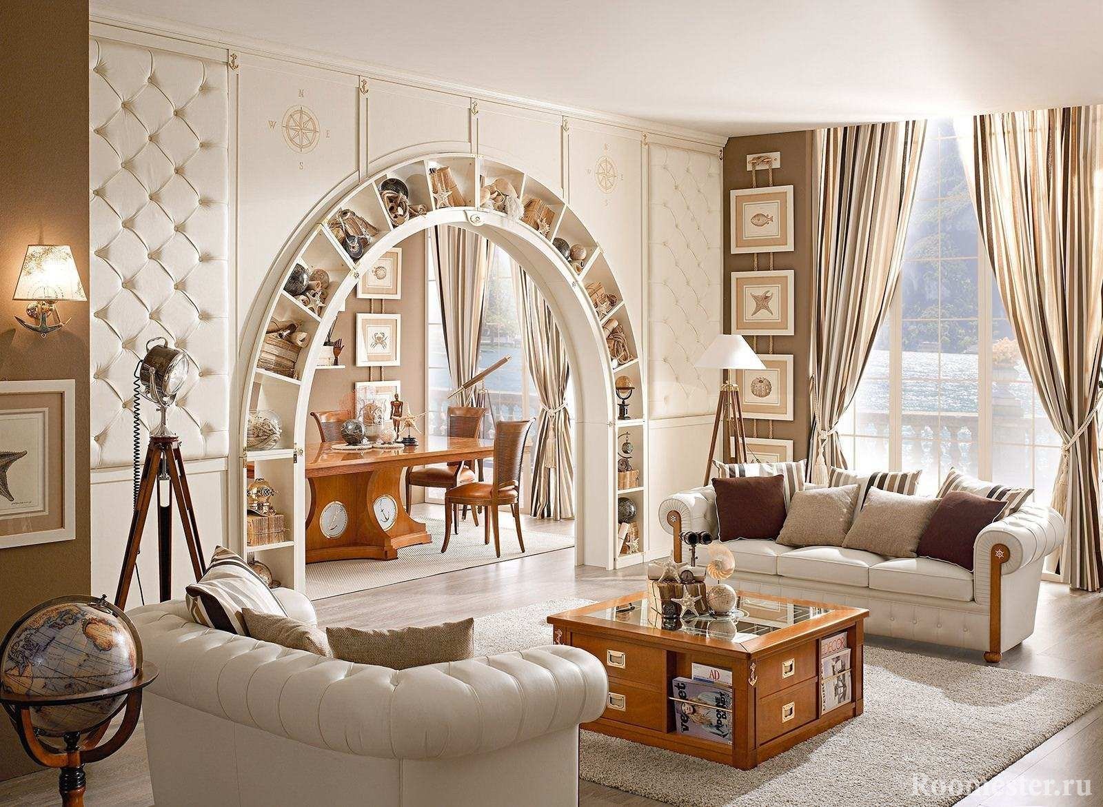 - Арки. Они могут быть полукруглыми, симметричными и асимметричными, стрельчатыми. Их часто дополняют лепниной, колоннами, оборудуют различные варианты подсветок;
