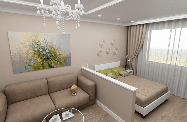 - Другие варианты: поставленный на границе зон диван, который расположен спинкой к кухне. Или зонирование с использованием комнатных растений.